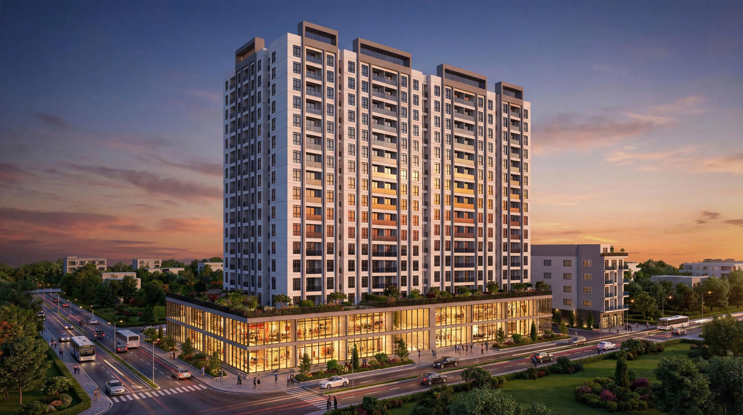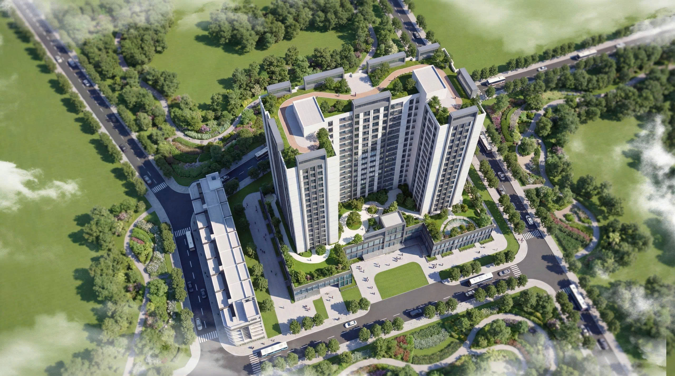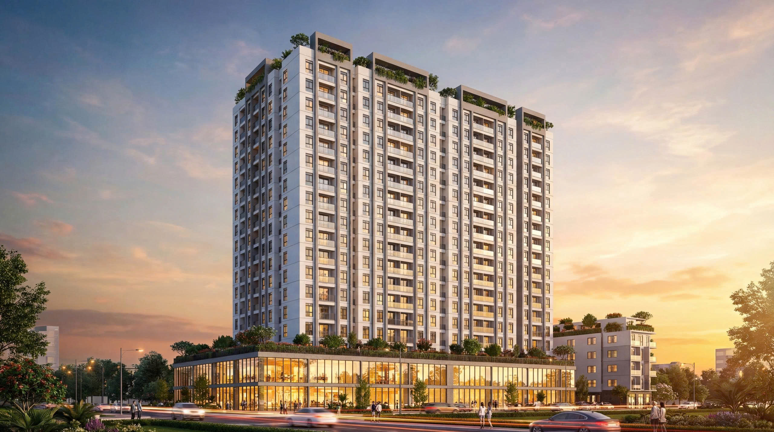 Tương tác cộng đồng: Khối đế thương mại sầm uất với hệ vách kính lớn tối đa ánh sáng, tạo cảm giác sang trọng, kết nối cộng đồng, trong khi các tầng mái (Rooftop Garden) được quy hoạch thành không gian tiện ích phức hợp phức tạp, nơi chúng tôi tạo ra các tuyến đường đi bộ, sân chơi và vườn sinh thái trên cao.